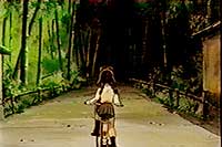 Juubei-chan meets some of her new classmates like an odd pair of girls, Shouko and Sat-chan, who are not afraid to introduce themselves. Shouko is definitely from Kansai as she sports a Kansai dialect and Sat-chan is more the "straight man" to Shouko's wackiness as she mumbles monotonic words now and then. Juubei-chan completes her day at school and returns home. She rides back on her bike via the bamboo forest where she accidentally runs her bike into her father who is lying asleep under a bamboo tree. "Pocha Pocha de Purin Purin no Bon Bon," says a voice quietly as Juubei-chan stops in midstep to aid her father.