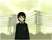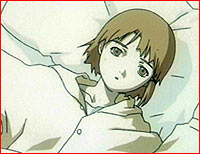 The story itself begins with a young girl, Yomoda Chisa, at first seen doubled over in despair in a Tokyo alley and next seen standing precariously on the edge of a building's roof, grasping the handrail while trying to decide something. The depression of her existence seems suddenly to lift as her expression resolves into one of freedom, and indeed she looks much like a bird about to take flight as she comes to a decision and lets go of the railing -- only to fall a dozen stories to her death in what appears to be suicide. Things are not this final, however. At school the next day, one girl is driven to tears as she receives an e-mail from the dead girl. On closer observation, the classmates soon discover that everyone received the same e-mail. When asked if she received it too, Lain answers "I don't check my e-mail," whereupon her friend Alice says she should check her e-mail everyday. Later, Lain is sitting quietly in her room contemplating, and then asks her father for a new Navi, which surprises and amuses the man. "So you've finally caught the bug, eh?" he muses. Later, as Lain gets used to her new Navi, Chisa starts talking to her from out of the iridescent wash of data on the display screen. In response to Lain's question about the girl's death, Chisa replies, "If you can overcome the fear, you'll find that you don't need your body here." And when Lain asks why she would want to be there, Chisa says, "Because God exists here."