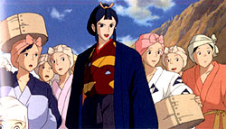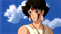 San, the Princess Mononoke, is the adopted human child of the Wolf God, Moro. She has been raised by the wolves and hates humans for their destruction of the forests. She has sworn to defend the forest and kill Lady Eboshi, even if she dies trying. A high spirited, feisty and energetic girl, she is also the object of affection of Ashitaka. |
