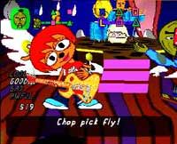 There are seven stages in Um Jammer Lammy and each of them contains a "teacher" to which Lammy must mimic by playing her guitar. The music ranges from a "Chef from South Park" Rhythm and Blues theme to a headbanging Heavy Metal theme. The player must keep to the rhythm and hit the buttons in a certain sequence or otherwise face a repeat of the level. There are four different ratings, Cool, Good, Bad, and Awful, which are dependent of the player's ability to stick to the beat and hit the right buttons. The difference with Um Jammer Lammy is that you can reach the "Cool" rating the first time you play a level, which gives this game better enjoyability. With Parappa the Rapper, the player had to mash the buttons to obtain a "Cool" Rating and Um Jammer Lammy penalizes for it.