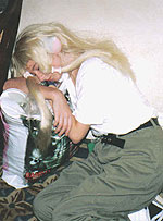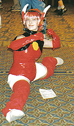 I spent the rest of the day either interviewing Wendee and Tiffany for my radio show or recording radio "drops" from typical con-goers. In case anybody was wondering, I was dressed-up as Nabashe from Excel Saga. Chicks dig the 'fro when they're not gigging to each other over yaoi every 2.5 seconds. Other notes of interest includes the commerical release screening of "Risky Safety" with intros by Wendee Lee who directed it and Steve Bennett's famous cel-painting workshop.