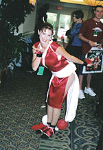 Now for people who attend cons on a regular basis, it's a well-known fact Friday is the "slow" day. But even then, one could get an idea of what's the popular series to cosplay off of. At this con, it seemed EVERY OTHER girl cosplaying was dressing up like one of the MANY incarnations of Chi from Chobits. How many Chi's do we need? The second theme was Final Fantasy X with some cosplay girls dressing up as Yuna and Rikku from FFX-2 (which last I checked hasn't even been officially released yet). And the third is something of a sleeper hit: Naruto. There was at least one person dressed up as a different character from that show in order to make a complete set. Then you had the usual gambit of cosplay inspiration: Inu-Yasha, Ranma, Sailor Moon, Evangelion, The Clamp Universe and individual characters from video games by Capcom, SNK and non-FF titles by Squaresoft.